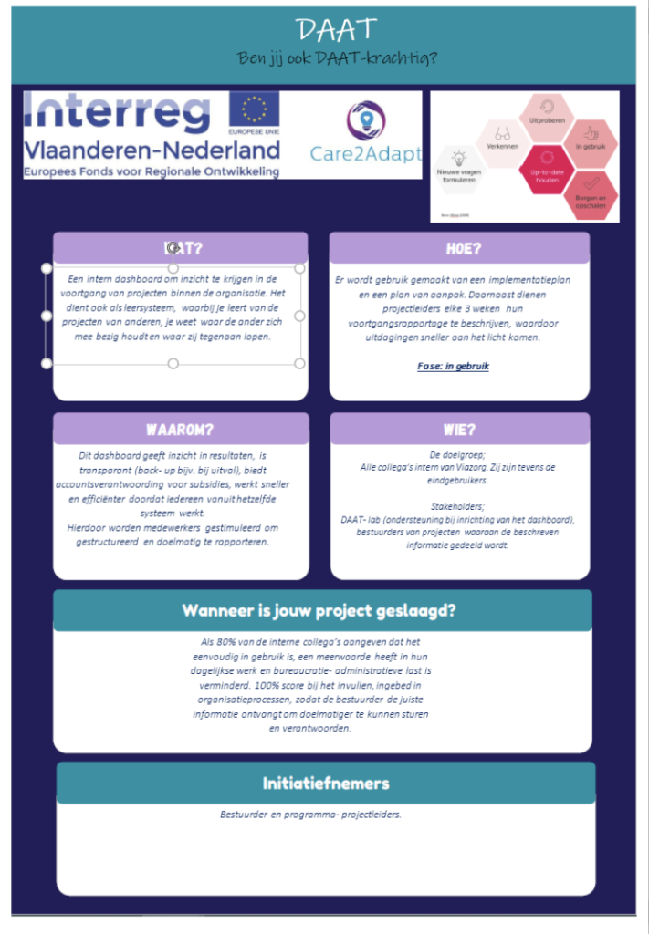Het groeiende personeelstekort is een van de grootste uitdagingen waar de Vlaamse en Nederlandse zorgsectoren voor staan. Innovaties zijn een sleutel tot de oplossing. Dat vraagt om een verandering in de organisatie en dat is bij veel zorgorganisaties een uitdaging op zich. Met name het implementeren en opschalen van innovaties en het wendbaar houden van de zorgorganisatie is een vraagstuk waar veel organisaties mee stoeien. Het Care2Adapt-opleidingsprogramma speelt in op deze behoefte. Vanaf 17 en 18 november worden een jaar lang 35 medewerkers van Vlaamse en Nederlandse zorgorganisaties opgeleid om ervoor te zorgen dat de zo nodige innovaties ook in de praktijk duurzaam worden geïmplementeerd en opgeschaald. Hiermee kunnen zij hun organisatie fundamenteel en toekomstgericht versterken.